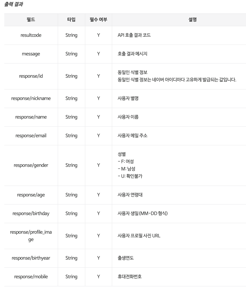 - 클라이언트는 발급받은 액세스 토큰을 사용하여 네이버의 리소스 서버에 사용자의 정보를 요청합니다.