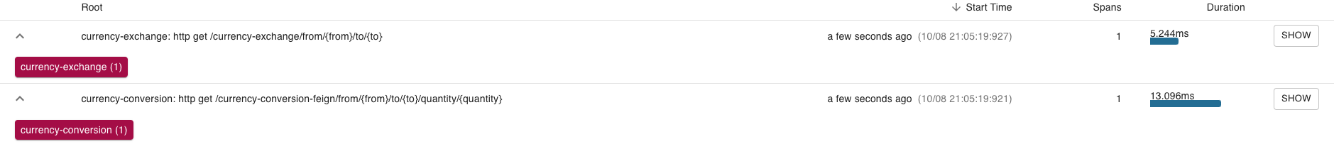 /currency-exchange/from/{from}/to/{to} 의 요청 추적 데이터 행의 가장 오른쪽에 show를 눌러보면,