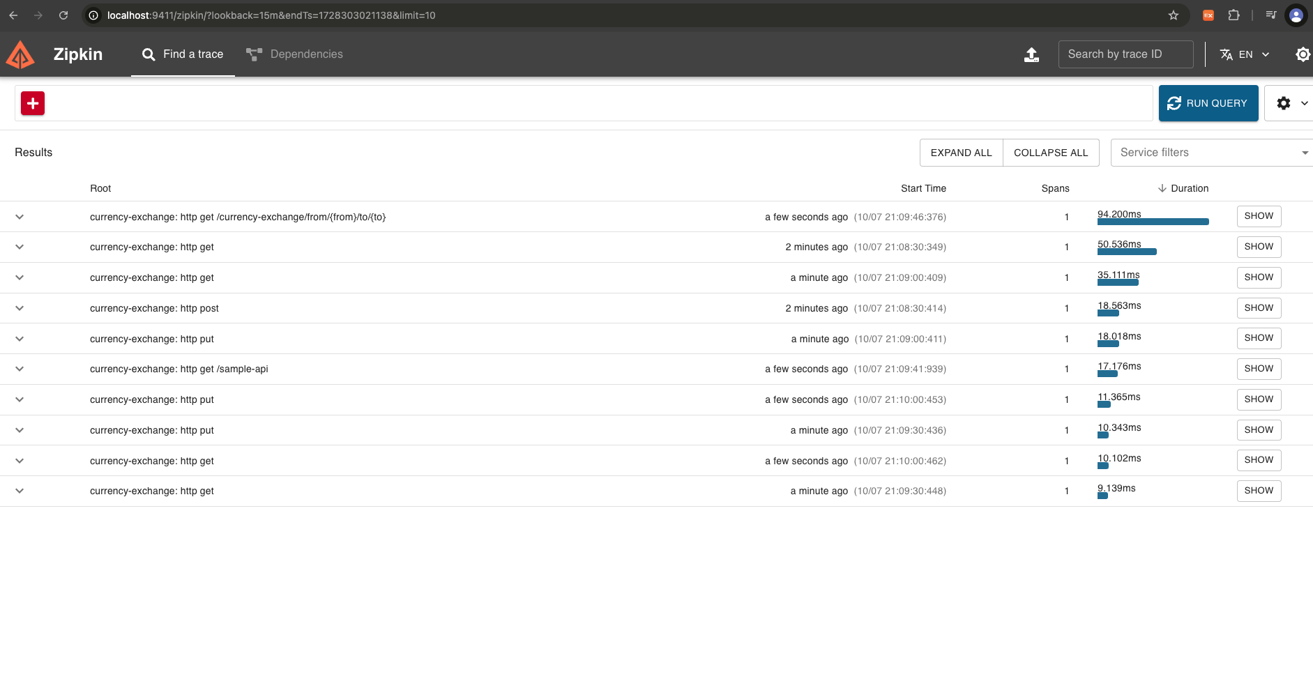 http://localhost:9411 로 접근하여 RUN QUERY 를 눌러보면 이미지와 같이 데이터들이 쭉 나옵니다.